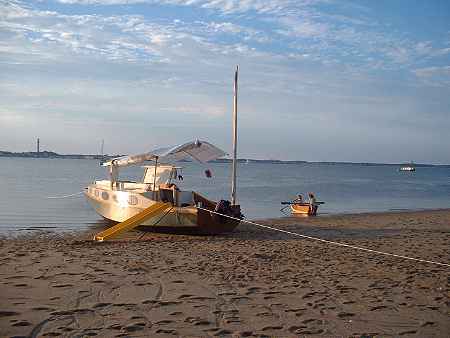 "We had an amazing time living aboard Cormorant (christened "Sea Fever") in Provincetown harbor for 5 days. The tide there was rising and falling about 12 feet a day with the full moon. We'd be high and dry up on the beach for breakfast, swimming off the boat at lunchtime, walking the flats again by dinner. It was a blissful time for me and my wife and two girls. We moved around, took little sails here and there across the harbor (West End to Long Point, then to the lighthouse, then to the East End, etc.) anchoring here and there, usually just running it aground as the tide allowed and staying for a while. Many shells were collected, and tidal pools investigated. Of all the harbors I've ever seen, it is the most alive. It's a couple of miles across and fresh sea water flushes the whole place twice a day. The number of snails, clams, crabs, fish of all sizes, mussels, eelgrass, etc. was just mind-boggling. On high tides I'd go spearfishing (many attempts, no luck) where at low tide I'd been walking around.