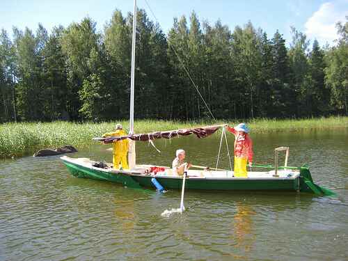 The Raider was finished in time for the 2008 Finnish Raid. Norm jetted over a bit early to sort it out or at least get used to it. He took along his Normsboat sail. The race was apparently its first time in the water, more or less. Here it is being paddled out for a sail: