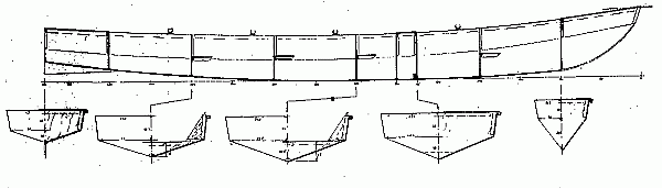 The idea was a boat long enough to take four at the oars, with a folding rig that could be left up while rowing or quickly taken down and up again as the winds advised. I suggested a V bottom as it would row the best and beaching was not going to be a problem. The lugsail was lifted from the Normsboat. (I see we were thinking at the time of offset oarsmen each with a single long oar but it was first rowed with pairs of oars. I have been told that rowing with single long oars is preferred in rough water but that way you will always need an even number of oarsmen.)