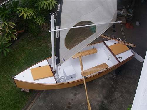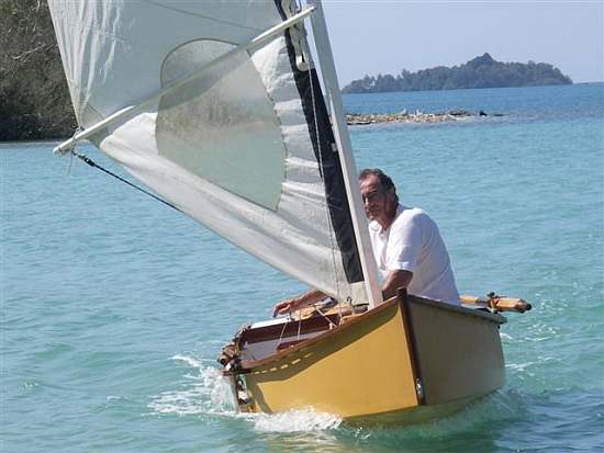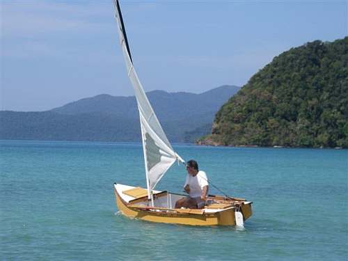 Attached are some pictures from building and sailing Mixer.Started building in Nov.2009 and finished in March 2010. In Thailand localy manufactured exterior plywood is of good quality but heavy( Keruing wood is used).For the bottom I used 7 mm (35 lbs ! )but for everything else on the hull I used 5mm(22 lbs ! )and the wood for framing the transom and side framing the bulkheads is red cedar(not western).Did not glass the bottom. Mixer completely stripped and ready to put on the car roof weighs exactly 100 lbs. I finished all the spars for a balanced lug but then I built a stub mast(60mm square cross section) and use my old windsurf sails on a bamboo spar which is pulled up to the stub mast through a 2 to 1 purchase.Works rather well. Drawback is no reefing possibility and have to lower the sails and change to a smaller one (have 5 sails from 45sqft to 67sqft).The seats which are demountable make the boat much more comfortable and give you the possibility to outride a little bit.I think Mixer is more stable than you expect and standing up and going around feels safe to me(I weigh 160lbs and my wife 98).I like that Boat.
