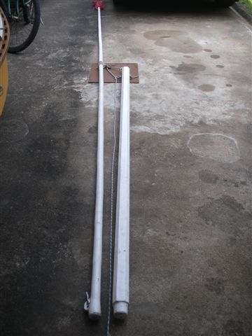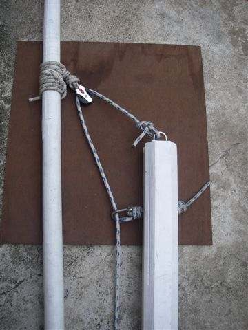 -The rope lashing at the lower end of the windsurf mast has to be a little slack otherwise it will have a lot of tension and may cause some damage to the fixing when lowering or raising the windsurf mast.It is actually only necessary when raising it.During raising this mast it may settle beside the mast foot mold but this is not a problem as it easily can be moved into the mold with one hand before the halyard is fastened.There is certainly room for improvement by tinkering with the geometry of the rope lashing.My mast foot looks a bit overbuilt and could surely be in one piece for both masts.