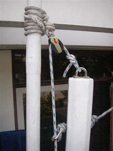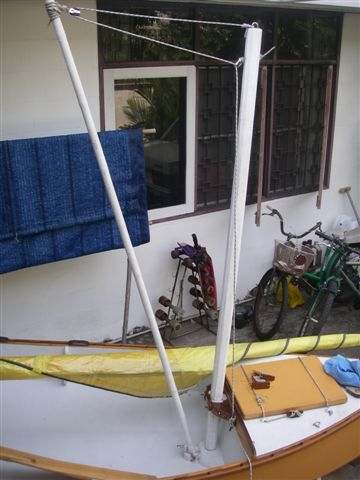 -The block lashed at the wind surf mast should be alittle bit above the top of the stub mast.Then the halyard holds the windsurf mast down in its mast foot.