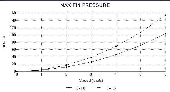 (Here is a chart that you can use to figure the pressure that water exerts on an underwater board at various boat speeds. I've shown two values of the force coefficient, C=1 that I recommend, and C=1.5 for you optomists.)