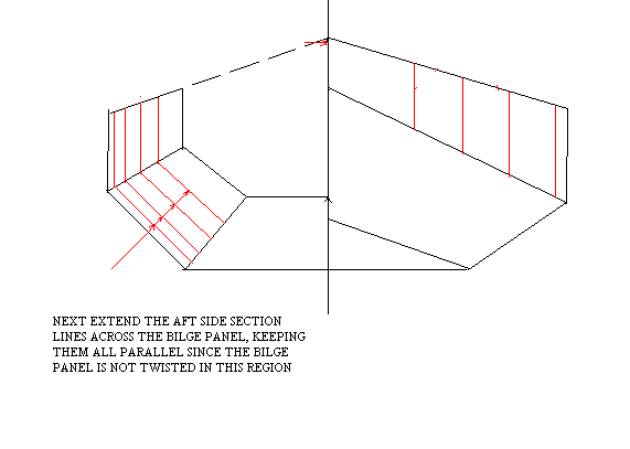 But since there is no twist in the panels in the stern we can also draw the lines that represent the bilge panel in the end view, like this: