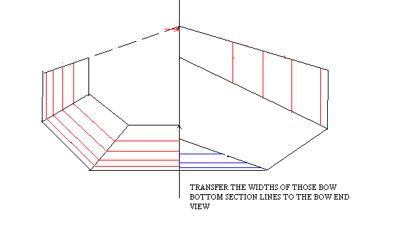 Now we also can measure the widths of the stations along the bottom plank in the bow region and transfer those to the bow end view, like this: