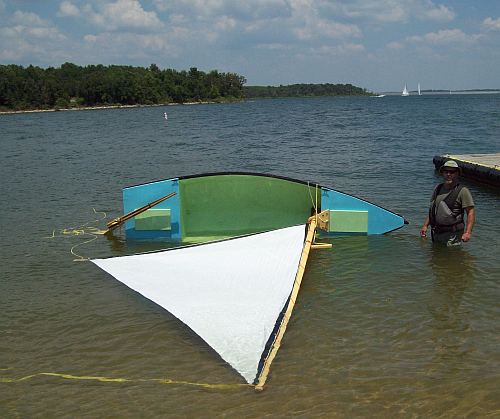 I think David Hahn's Out West Picara is the winner of the Picara race. Shown here on its first sail except there was no wind. Hopefully more later. (Not sure if a polytarp sail is suitable for a boat this heavy.