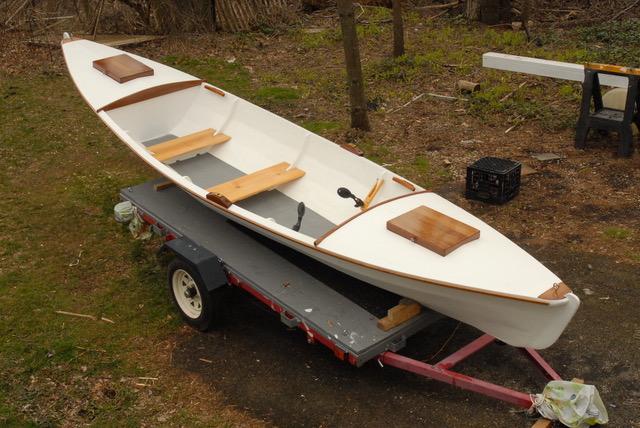 Construction is with taped seams from three sheets of 1/4" plywood, the same bill of materials as for the larger Robote. Robote will be a lot better if you are rowing with a passenger all the time. Vamp might be a handier impulse boat for a solo boater, although it can take two adults in a pinch.