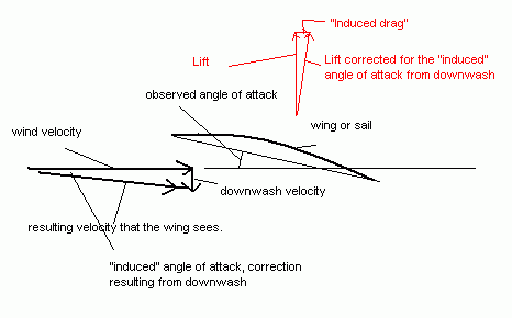 So far I'd be tempted to say "So What!" The short wide wing has bigger tip vortices than the long narrow wing. But the aero guys point out that the swirl produces a "downwash" over the entire wing, not a good thing at all since the wing is supposed to be pushing us up. The aero guys simply add the downwash to the real wind like this: