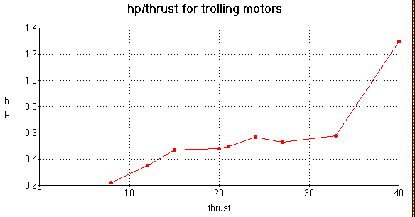 In Douglas Little's book ELECTRIC BOATS he presents some power measurements from typical trolling motors. Remember that his "horse power ratings" are based on current measured TO the motor and not the acual measured output of the motor. Here is a chart I made from some of his tests: