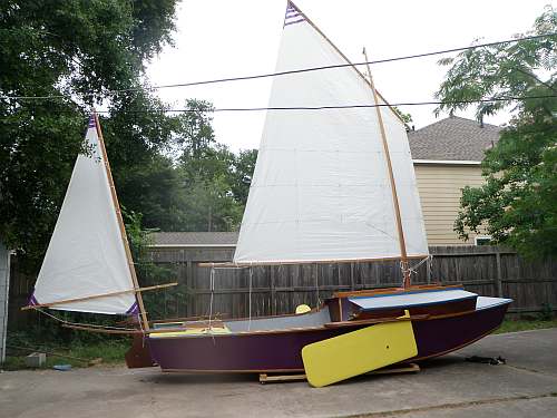 This is Ted Arkey's Jukebox2 down in Sydney. Shown with the "ketchooner" rig, featuring his own polytarp sails, that is shown on the plans. Should have a sailing report soon.