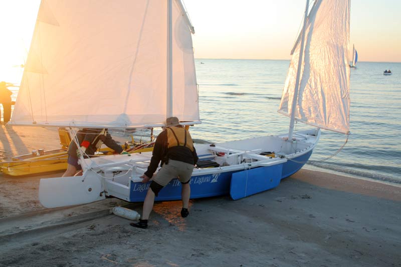 Well, I was thrilled. My main caution would be that this probably is not a good solo boat due to its size and split rig. I think it might be a good family boat in that there is plenty of room for everyone and a rope for all idle hands to play with. The other caution might be that, even though the boat has big buoyance boxes, it also has large cockpits to swamp in a knockdown and it will roll upright with a lot of water to bail. So you note on Gordo's boat he has inflated fender tied to the mast head, an idea to reduce the carnage of a knockdown.