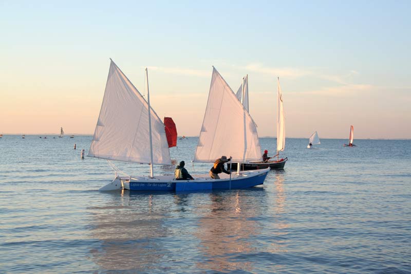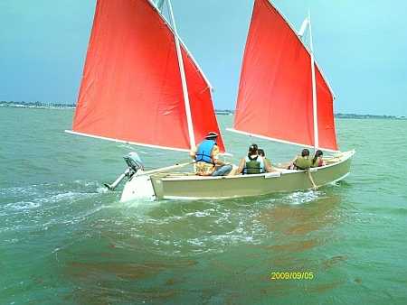 The prototype was quickly built by Gordo Barcom in Texas and here he is blasting along with family and polytarp sails straining. It was clearly a fast roomy boat: