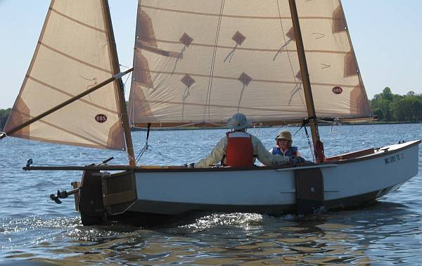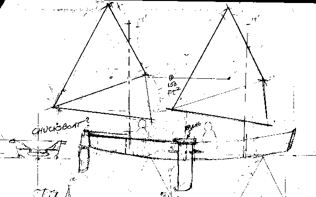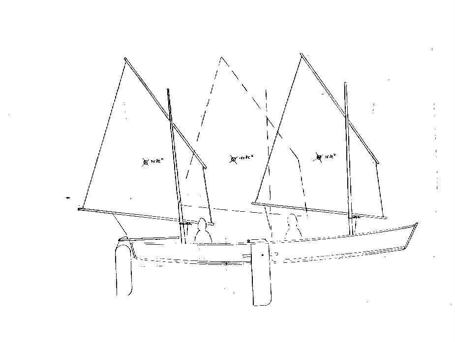 The sail rig was to be a split rig with identical lugsails fore and aft with the option to sail with just one of the sails mounted in the center, like this: