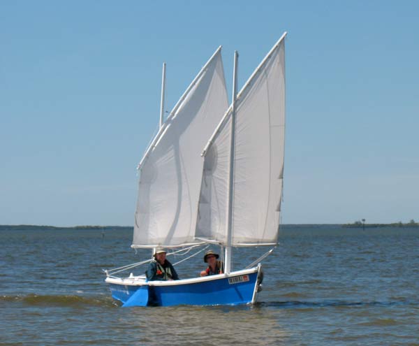 You might recall that Karl had built the prototype of my Jewelbox design a while back and his brother Pete had built the Petesboat design that was based on Jewelbox. But even back then Karl had told me that he was thinking about a trailerable version of Bolger's Black Skimmer. As his thoughts advanced Karl had blended in ideas from Bolger's Martha Jane, in particular the yawl rig with a balanced lug main, and water ballast. So this sharpie is Karl's design, not mine. I have no idea if he has plans for sale. Karl is retired now and I've lost touch with him but he stopped by last year on his drive from Canada to Texas.