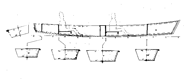 This boat was designed for Duckworks to run the Texas200, 200 miles of brisk downwind running they say in the somewhat protected waters of the Texas intercoastal waterway. The boat was supposed to be cheap and quick and hold two crew with floorspace for them to sleep on board. The basic idea I had was to stretch the Mayfly16 with an 8' plug in the middle. In the end I kept the basic cross section and stretched it out with a simple flat iron skiff shape. The bottom is the width of a sheet of plywood which simplifies things even more. The first doodle looked like this: