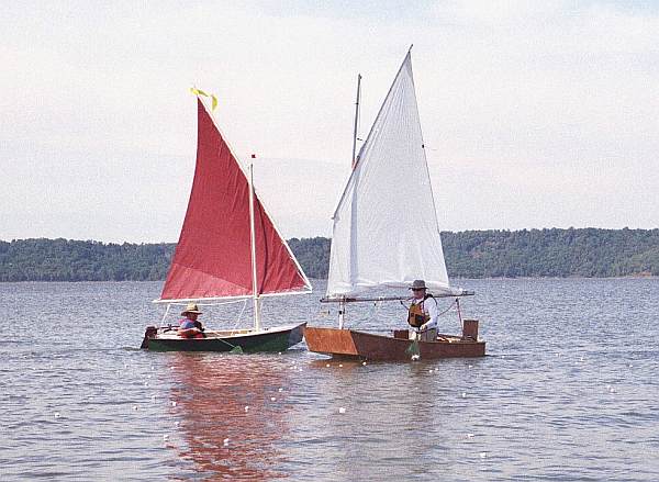 This is Ted Arkey's Jukebox2 down in Sydney. Shown with the "ketchooner" rig, featuring his own polytarp sails, that is shown on the plans. Should have a sailing report soon.