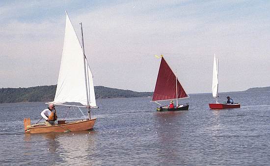 ...there was more boat swapping and swamping going on. Here Kenny Giles tries out Stan Roberts' Piccup. And in the distance you might make out the only crash I was aware of. A new sailor had capsized Mike's take apart dinghy and with no buoyancy tanks there was no getting it upright. The Elegant Punt is sailing to the rescue but could only supply moral support. Eventually a SkiffAmerica came to gather up the swamped boat and swimmer.