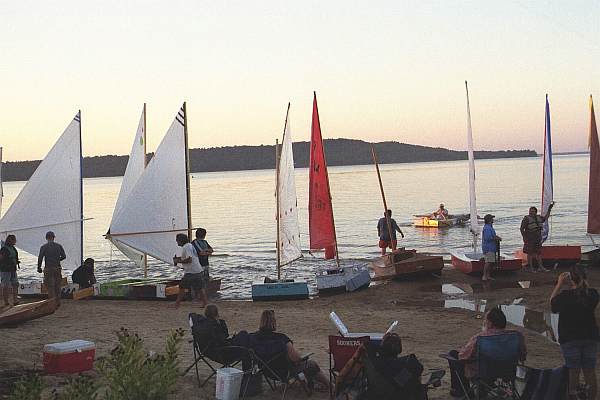 The Duckers were going to have a real race. They had some other boats go out and anchor to define the course. I was on shore, too far away to get a meaningful photo. They mill about as racing sailboats do before the start and then THEY'RE OFF!! One boat lost its mast. I think there were some stumps just under the water out there that may have been a factor. But Brad in a Storer hull with a huge polytarp balanced lug rig with a 16 to 1 tack line tackle easily outpaced the fleet and won.