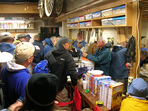 Packed, isn't it. They cleared away the supper and readied all for the final lecture of the night which made us all feel warmer, or at least made us realize that we could be a lot colder. So they turned off the lights (so I have no photos) and Howard Rice showed slides of his 1988 trip, in a Klepper fabric sailing kayak, around Cape Horn. Such a trip! He threaded his way between Argentina and Chile, who were sort of at war and shooting at each other at times, getting "detained" several times and escaping as required. When his planned trip was blocked by the officials he jumped onto a sailing derelict bound for Antarctica, then jumped that ship with his gear midocean and paddlesailed back to the Horn. Then stranded for weeks waiting for weather and a trip through a mine field, etc, etc, etc. He finally made it and linked up with another venturer to do it again. Now he lives in Micronesia so I guess he learned a lesson of sorts down at the Horn. Anyway, afterward maybe it didn't seem so cold or windy in Oklahoma at the time.