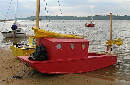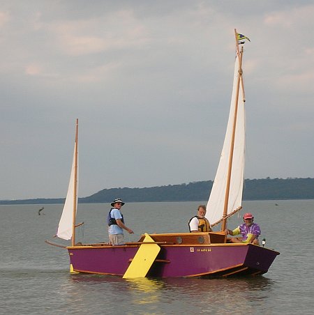This is Ted Arkey's Jukebox2 down in Sydney. Shown with the "ketchooner" rig, featuring his own polytarp sails, that is shown on the plans. Should have a sailing report soon.