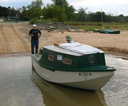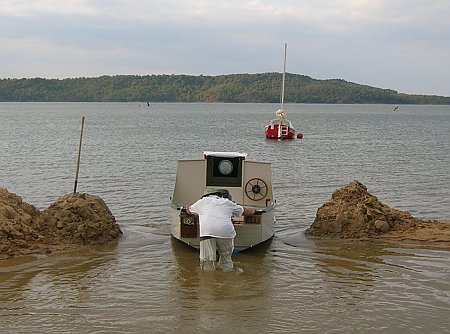 Paul launched the Family Skiff, now converted to a power boat with a small cabin, into the "hole" that was dug in the sand at the end of the ramp that allows launching in low lake levels...