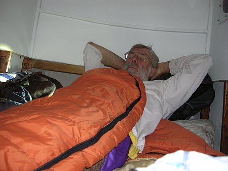 ...and it really wasn't too bad. Slept angled across the little cabin on a lawnchair matress. Later I found I could really stretch out by letting my feet poke out the cabin door. But even pulled up on the beach totally out of the water wasn't far enough to keep rogue waves from hitting the cabin every half hour or so. Not sure how the heavier boats dealt with that.