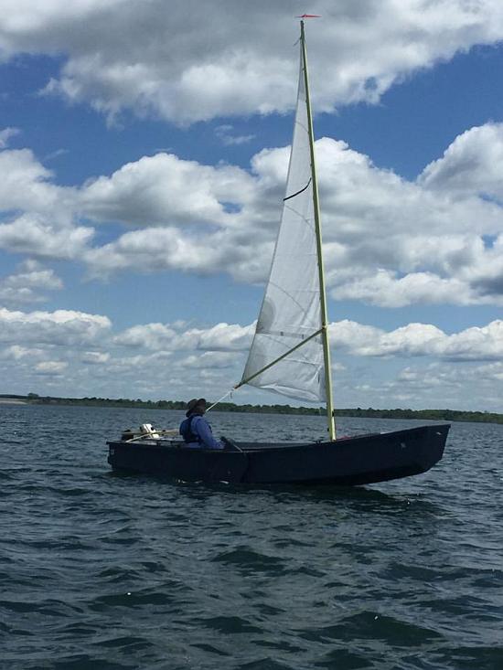 The sail rig uses a balanced lug, 113 square feet and the same as that of a Bolger Windsprint.