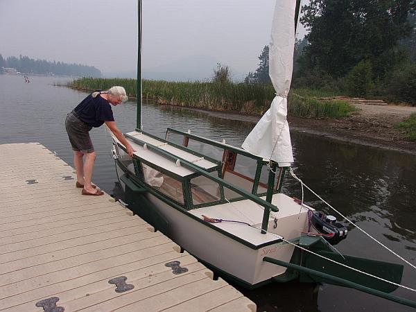 Update, 2007. Chris Feller completed his Philsboat, probably the first prototype completed, and brought it to the 2007 Rend Lake Messabout. Very well made and to plans except he used the 91 sq ft lugsail he had on hand for his AF3, with some mast rake changes he calculated with his "sail area math". Sailed correctly rigtht off the drawing board, so to speak. We had a chance to use it for a few really nice days. In a good sailing breeze, say 10 to 15 knots with occasional whitecaps, our gps bobbed between 5.5 and 6mph for two hours of reaching as we crossed back and forth on the big lake. When I used the Philsboat I thought it was probably just as easy to enter from a beach as the blunt bowed Scram. The front deck is about 2' high so you can sit on it and swing you legs around onto the deck and then into the cabin.