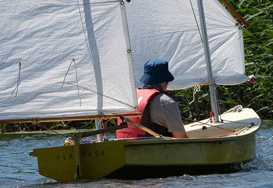 Update, 2007. Chris Feller completed his Philsboat, probably the first prototype completed, and brought it to the 2007 Rend Lake Messabout. Very well made and to plans except he used the 91 sq ft lugsail he had on hand for his AF3, with some mast rake changes he calculated with his "sail area math". Sailed correctly rigtht off the drawing board, so to speak. We had a chance to use it for a few really nice days. In a good sailing breeze, say 10 to 15 knots with occasional whitecaps, our gps bobbed between 5.5 and 6mph for two hours of reaching as we crossed back and forth on the big lake. When I used the Philsboat I thought it was probably just as easy to enter from a beach as the blunt bowed Scram. The front deck is about 2' high so you can sit on it and swing you legs around onto the deck and then into the cabin.