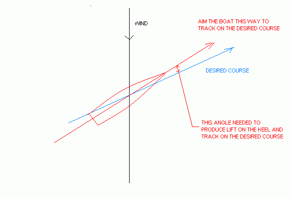 So the skipper always has to aim his hull to windward of his desired course and he might think of that as leeway. Another way to look at it is in the above example he is trying to point 35 degrees from the wind and he aims it that way, but the boat's track will be 10 degrees downwind of that because of the leeway. So he is tracking 45 degrees to the wind close hauled. Mind you his hull is pointing 35 degrees to the wind but it isn't going where it is pointing due to mandatory leeway.