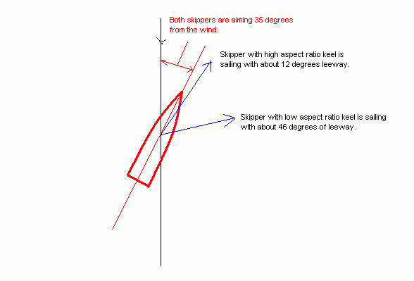 Now imagine these two are sailing together in the same wind, close hauled to sail as close to the wind as possible. Both sail and keel are brought to just below the stalling point while they do so. The skipper will note that if he tries to point any closer to the wind with his sail that it starts to "luff", that is the leading edges start to flutter and his sail power is reduced. At the same time he might watch his wake and note that his keel has not stalled and he is not making too much leeway. Both boats are the same except that the sail and keel aspect ratios are different.