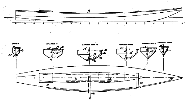 Marksbark was drawn well before I put a simple straight plug in the middle of Toto to get a Larsboat. Today I would suggest simply putting a 5' straight plug in the middle of Toto to get the length of Marksbark, long enough for a sliding seat. Instead back then I stretched out the Toto which will probably look more elegant but the prototype builder will have to keep a close eye out to see if the pieces all fit since all this was done before I figured out how to use a PC to give the shapes of the expanded panels. He ought to do what I did with the original Toto - stick it all together except for the bilge panels and then trace the shape of the bilge panel hole onto cardboard and transfer to plywood. The Marksbark plans do give the shape of the bilge panel but as with all multichine shapes it pays to cut that bilge panel well oversized and trial fit to see if the lines are correct. The thing is the last piece of the puzzle catches all the previous mistakes of the builder (and designer!) and a trial fit before cutting to the line is always a good idea.