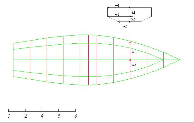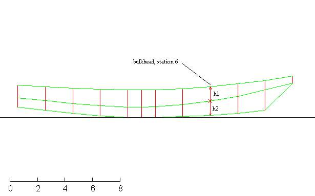How to determine the shape of the bulkheads? We will start with a real easy one, say the bulkhead at the front of the cockpit at station 5. Pretty simple. If you look at the side view at station 6 you can measure off the length between the bottom and the chine, and then the length between the chine and the sheer.