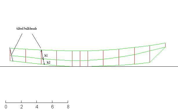 Well, you will need bulkheads in most boats to hold the boat in its shape and to divide it into various compartments and to provide structure for introducing loads from motors and sail rigs, etc. A canoe or rowing boat often needs none. Bob wanted an open compartment in the bow for the anchor and junk, and a wide open center cockpit for lounging, and then a motor hung on the aft part of that cockpit for easy access to the motor. That is he did not want the motor way on the stern. Phil Bolger has said over and over that a motor "well" inside the stern of a boat is a terrible thing, his opinion based on personal experience. So my idea with Bobsboat is to place the motor in a slot which is open to the stern and hopefully this will eliminate the badness of fumes and the well "pumping up" with water at speed. We shall see. So I'm placing the bulkheads like this: