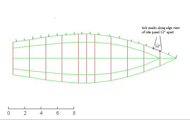 To get the true flat shape of the side panels you need to think in terms of peeling them off the boat and laying them flat. To do that you always need to draw a view of the boat that will show the proposed panel on edge. In our example let's use the top view to see the side panels on edge. (The side view shows the bottom panel on edge.) Here is how I used to do it. First get the edge view. Then "tick" the edge view at regular intervals, say every 12" in this case, like this: