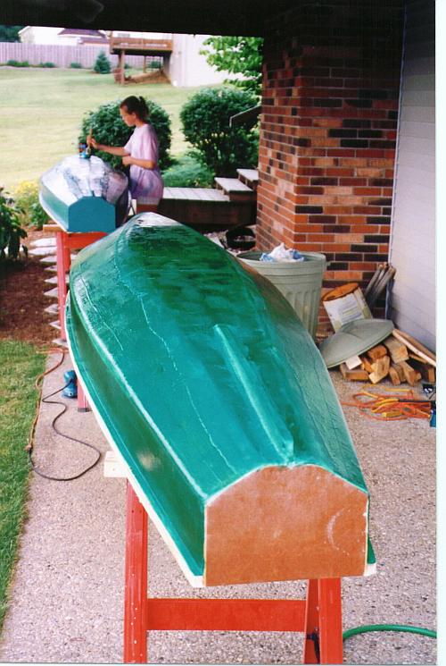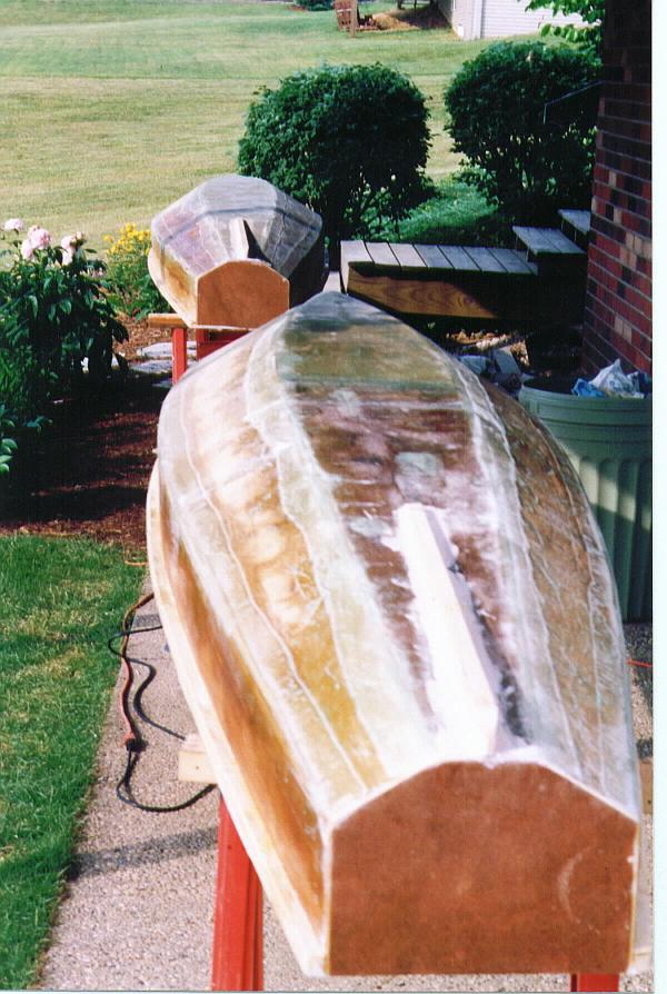 One boat is duct taped and turned upright ready for filleting with filled resin.