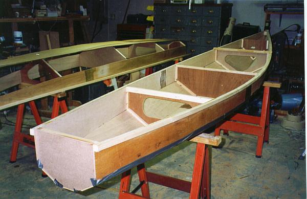 Anyway, River Runner uses five sheets of 1/4" plywood. The idea of the light ply is to keep the boat light enough to manhandle into a truck or onto a car roof but it will take a diligent builder to keep it light. I suspect the aluminum original would be no heavier. Simple nail and glue construction.