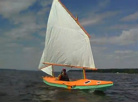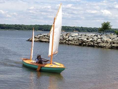 This is Ted Arkey's Jukebox2 down in Sydney. Shown with the "ketchooner" rig, featuring his own polytarp sails, that is shown on the plans. Should have a sailing report soon.