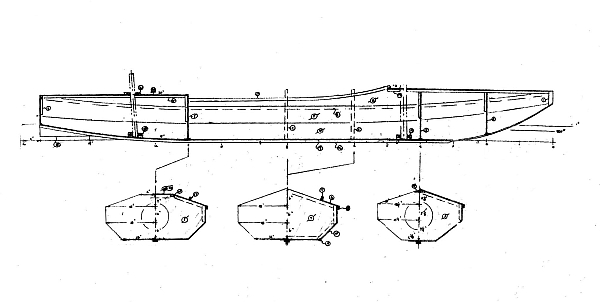 I had a request from Paul Moffitt, of the famous sailing Moffitts, for a sailing canoe. Now, a "sailing canoe" can mean a lot of different things. But to me the sailing canoes that you read about from the late 1800's were what we both had in mind. I had always put off designing one because I had the idea the usual sailing canoe design is too wide to be good with a paddle, and too narrow to be good with a sail. Many of the old classic sailing canoe designs were actually small decked over rowing boats that were wide enough to sail with some stability. I guess there were still called canoes because of their double ended shape and perhaps because they had recently evolved from true canoes which were rigged with small sails.