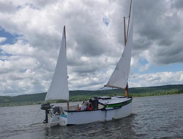 I've kept the same sail as with Woobo, a 75 square foot balanced lugsail. It hoists on a 13' mast with 11' yand and boom. All very low tech built with common materials.