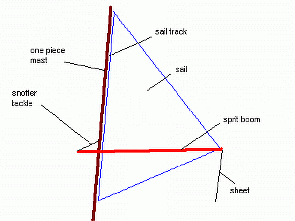 Pretty simple. These can be wickedly effective in that you can tighten up the sail, bow and arrow style, by hauling the snotter good and tight and a two or three part tackle on the snotter is the way to go. That will bend the mast aft and flatten the sail if needed just like modern racing boats. I think one great advantage seldom mentioned for this rig is that it can be set up by a beginner correctly from day one, although it may take him a while to learn the tricks with the snotter adjustment. They work great with a free standing mast.