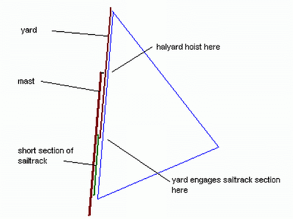 OK, what L. Francis did was simply attach the lower end of the yard to a short section of sailtrack attached to the aft face of the mast. I copied it with my Jinni because even on the prairie I could get a four foot section of sailtrack that would be plenty for the job. Since nothing slides down in front of the mast, as with lacing, the snotter attachment can stay attached as the sail is lowered. So to lower the sail you just release the halyard and it all folds back under control, unlike a true lug yard which can require care when it is not fully hoisted. You can leave it all down if desired and reef in the cockpit without standing. Once reefed I used a second hoisting point higher up the yard, the entire sail now would be a lot lower than originally, the sailtrack connection didn't need to be reset in any way. It just didn't slide as far up the mast track when reefed. The attachment from yard to sailtrack needs to be somewhat loose to keep from binding but I just used a normal sail slide with a 1/8" steel rod bent to a U and welded to small plates that bolted to the yard. It was slick. It was safe. I could drop and rerig it in terrible conditions without leaving the cockpit or standing up (Jinni had that mizzen which kept it head to wind in a bad patch).