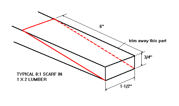 Let's say you need to join 3/4" x 1-1/2" lumber to make wales or chine logs for your boat. An 8:1 scarf in 3/4" thick lumber will be 6" long, like this: