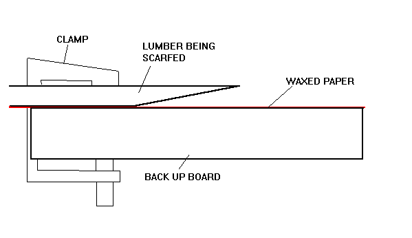 DON'T PLAY WITH THE SCARFED LUMBER UNTIL THE GLUE HAS CURED REALLY HARD! It may take a few days, depending on your glue and your climate conditions. Almost no glues set well below about 70 degrees. When I did the Birdwatcher mast scarfs it was in the middle of a wicked winter. I cut the scarfs with the router fixture, glued and clamped them up, covered them with a blanket blasted a salamander kerosene heater under the blanket. It got well over 100 degrees under there and they cured very quickly. Those scarfs are still holding!