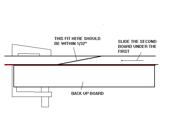 Then the board is unclamped and slid forward into the fixture such that once more the router will slice off another 1/4" of material, only this time there will be a lot more wood to cut. And so forth until the the entire scarf is cut. Or is it? I've found it best to avoid a total feather edge at the end of the scarf cut - leaving about 1/32" uncut seems ot work best, like this: