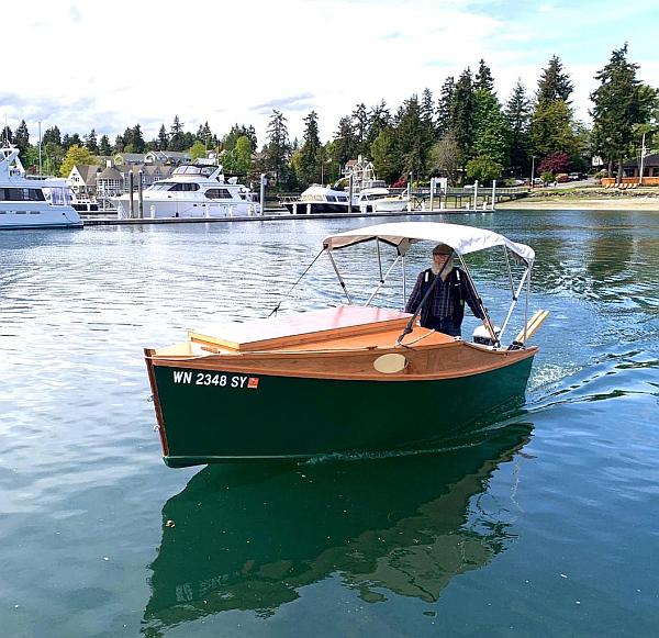 The QT plans also included a page of the same hull set up for a small motor, say 5hp max. Eventually one got built by Barron Wester. He he goes...