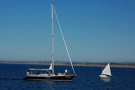 I think David Hahn's Out West Picara is the winner of the Picara race. Shown here on its first sail except there was no wind. Hopefully more later. (Not sure if a polytarp sail is suitable for a boat this heavy.