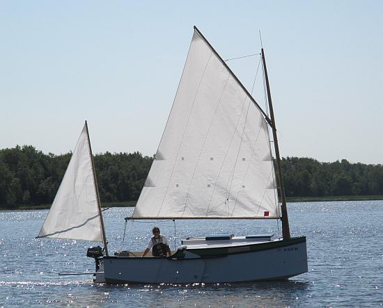 Sail rig is a large but simple 139 square foot balanced lug on an 18' mast. Mast is stepped off center to allow you to walk upright down the slot top and out the front. Should be rigged in an instant with no one going on deck ever. All very low tech built with common materials but effective.