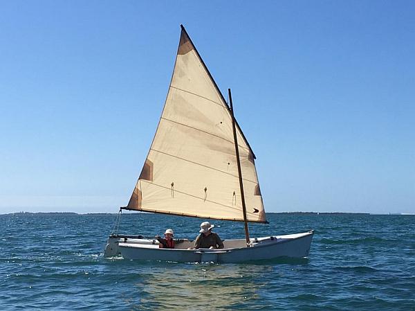 Left: Ross Lillistone built this Mayfly about ten years ago in Australia. He writes, "Me being skippered by my five year-old grandson. He has been in sailing dinghies since he was six months old....longitudinal trim is so important, and she is sailing beautifully in these conditions."