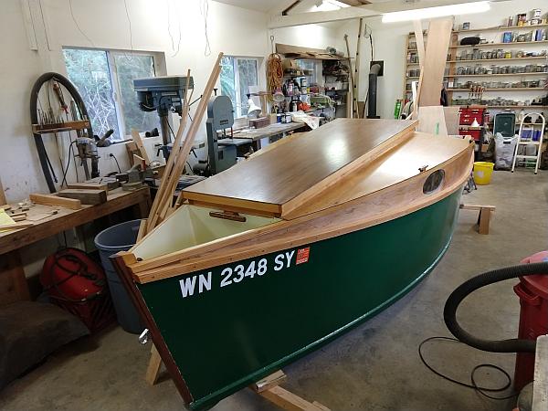 Sail rig is a large but simple 139 square foot balanced lug on an 18' mast. Mast is stepped off center to allow you to walk upright down the slot top and out the front. Should be rigged in an instant with no one going on deck ever. All very low tech built with common materials but effective.